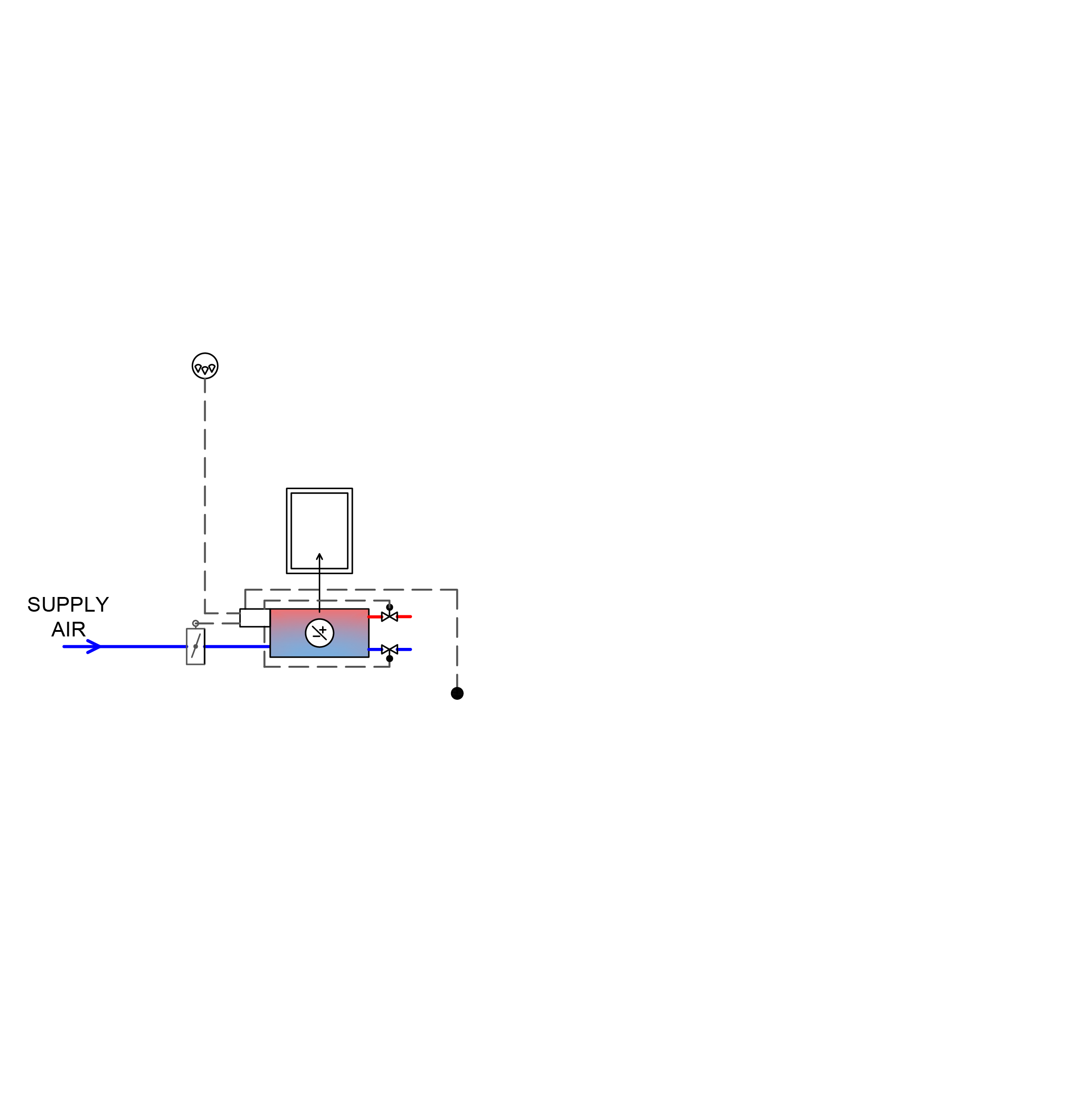 Då närvaro detekteras höjs minflöde till närvaroflöde oavsett rumstemperatur. Temperaturgivare har högre prioritet än närvarogivare, d.v.s. att vid för hög värmelast ökar flöde till fasadapparat trots att ingen närvaro registreras i rummet. Regulatorn styr, via inställbara P-band, ventilställdon på värme i sekvens med ventilställdon på kyla konstanthållning av rumstemperatur.