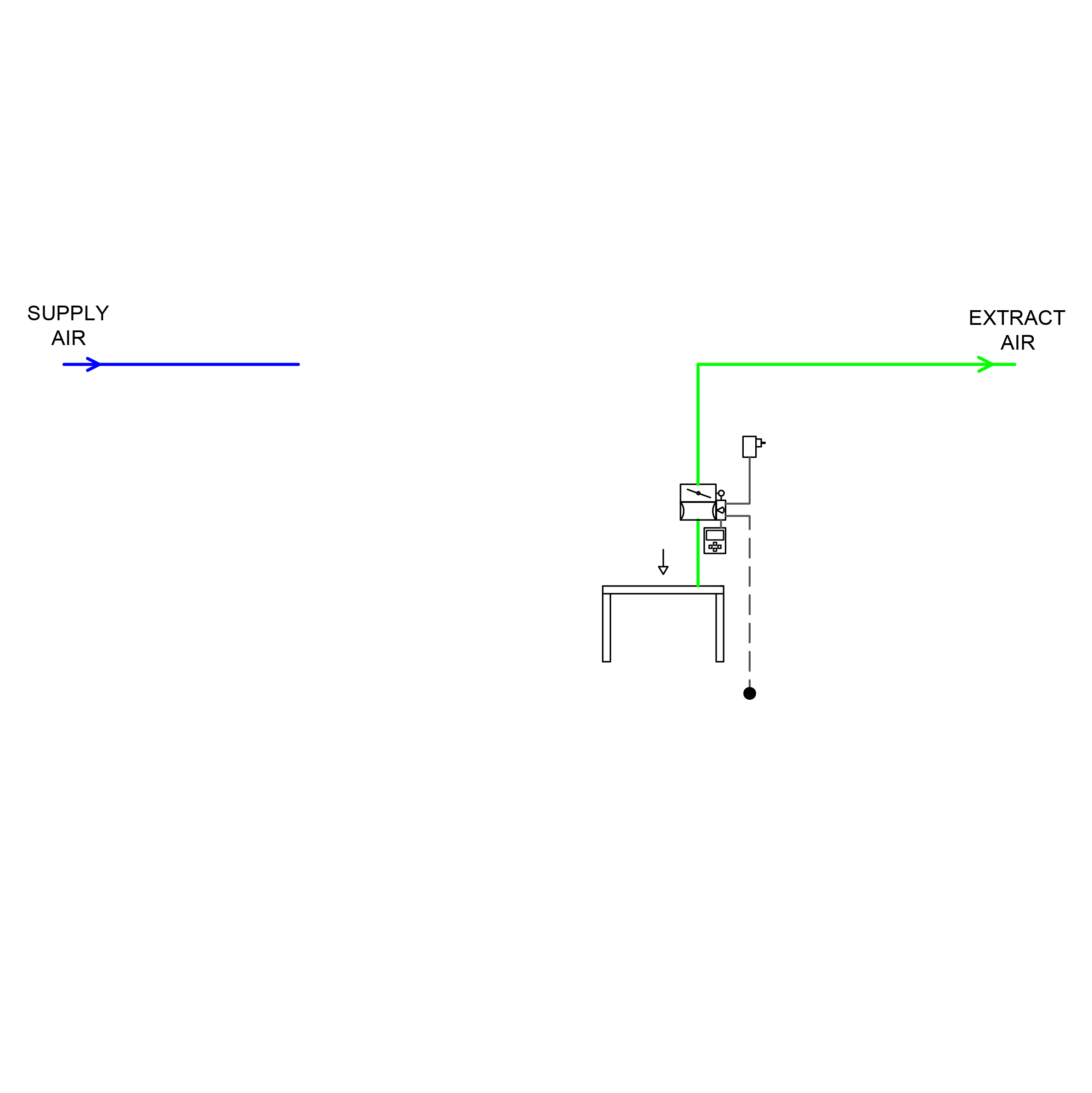 2-lägesstyrningen styr frånluftsflödet i min- eller arbetsläge, för att säkerställa inställt flöde i dragbänken.